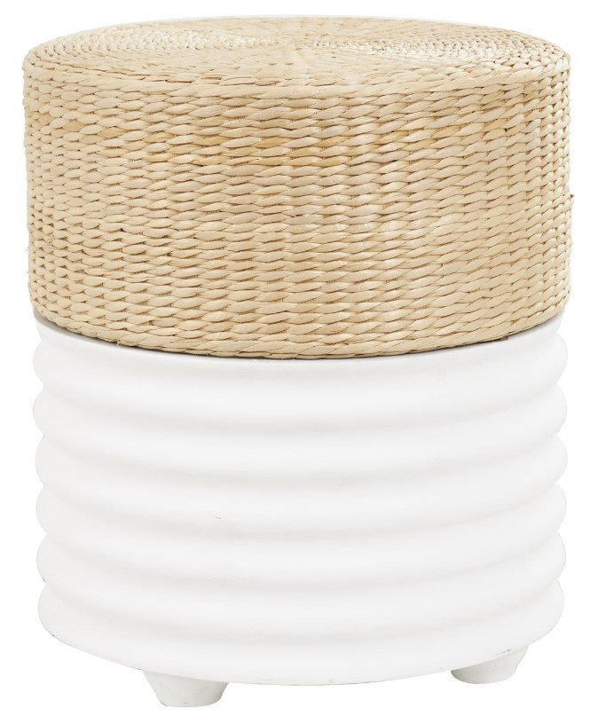 The cylinder shaped stool highlights bubble style ridges and a woven seagrass top that adds to its overall charm and beauty