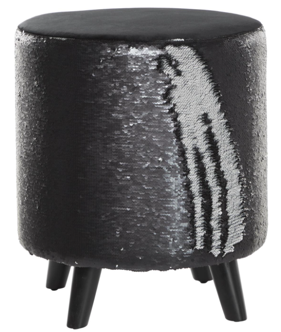 This remarkable silver vanity stool features a round shape and a black and silver sequin-patterned body exterior