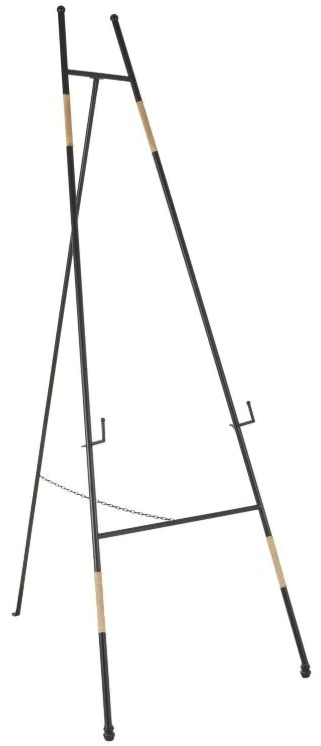 The triangle easel stand with wrapped brown rattan accents features a matte black finish, exuding sophistication. This metal easel features a practical foldable design, ensuring easy storage and transport, while the wrapped rattan accents add an organic touch.