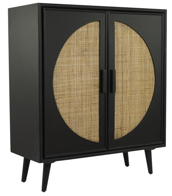 Square cabinet for storage is an eye-catching accent piece featuring an oiled black finish with a unique brown woven circle design