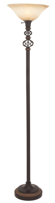 Designed with timeless sophistication, rich old-world textures and warm hues come together for a refined classic taste of luxury. Constructed from metal, glass, and polystone, the black room torchiere offers durability and sturdiness. The round tall lamp is a traditional style piece, showcasing a matte black finish with copper accents and glass top shade.Read More
