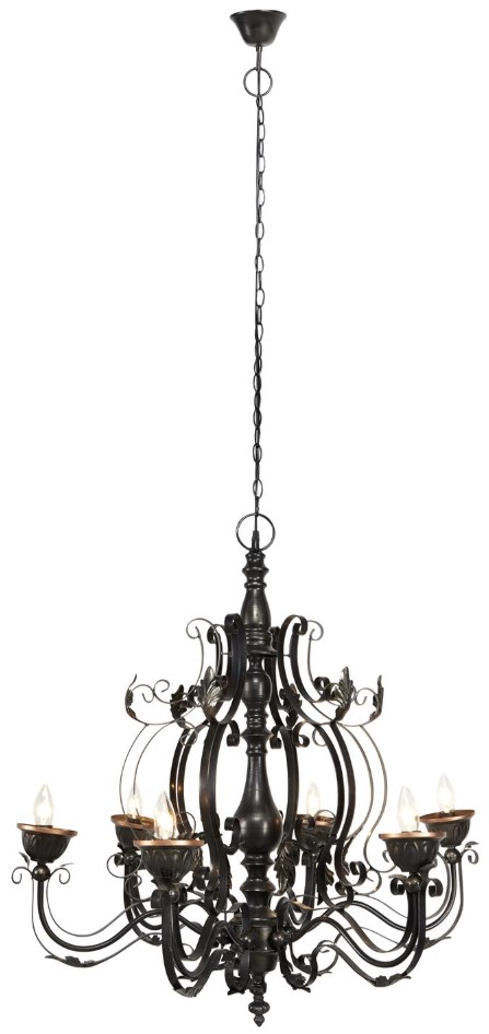 Large black metal chandelier with 6 candelabra bulbs. Solid iron chandelier body and canopy. Bold scrolling arms and rotund center shape with leaf-covered scrollwork at the top and along each of the 6 arms, each holding ornate candle plates with gold trim; the solid black hue adds an edgy glam style to this otherwise antique-inspired large chande.Read More