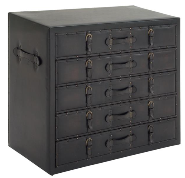 Designed with timeless sophistication, rich old-world textures and warm hues come together for a refined classic taste of luxury. The black room chest is expertly crafted from solid MDF and enveloped in faux leather, ensuring durability and longevity. Rectangle storage chest trunk boasts a smooth black finish, subtly accented with dark brown undertones and antique gold hardware. This wood chest features vintage-inspired luggage drawers adorned with faux leather buckle straps, bolted handles, and rivet detailing for an authentic touch. Smooth black chest closet storage accentuates a rectangular form that adds sophistication to any space. Each element of this traditional chest storage has been crafted with the faux leather pulls attached to the wooden frame which is detailed with riveted patterns.