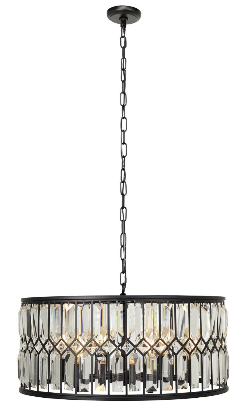 The cluster ceiling pendant light boasts an opulent matte black metal finish for its canopy, tubing and holder, elegantly contrasted by clear crystal accents. The metal chandelier's striking features include vertical crystal point prisms arranged in two rows with diamond-shaped crystals at the center. Maximize your ceiling space to add depth and dimensions in your home with this gorgeous chandelier. Beautifully designed and well crafted chandelier features eye catching structure for a mesmerizing focal point any where in your home. Cast a warm glow over your dining area or den with this sophisticated black ceiling light.