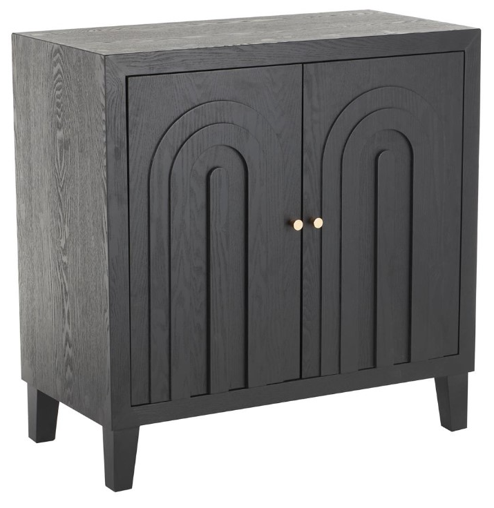 Rectangle cabinet for storage enchants with a rich black color palette, accentuated by gold knobs and black legs, all finished in a chic matte finish. This wood cabinet boasts a unique geometric art deco-inspired carved arch design on the doors, contrasted by luxurious gold knobs