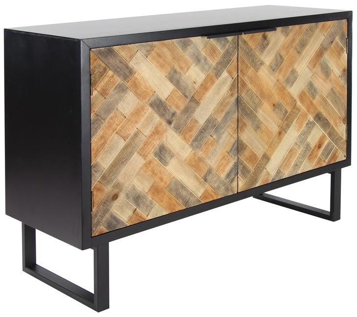 Embrace artistic expression with a style that highlights bold designs with sleek lines, neutral elements, and a minimalist aesthetic. Crafted from long-lasting wood and MDF with iron accents, this black room cabinet is as durable as it is stylish. Rectangle cabinet for storage highlights a classic oiled black frame, complemented by multi-tonal brown wood inlay doors that lend a contemporary touch. This wood cabinet features geometric wood paneling on each door, L-shaped bars for handles, and high under clearance for easy cleaning