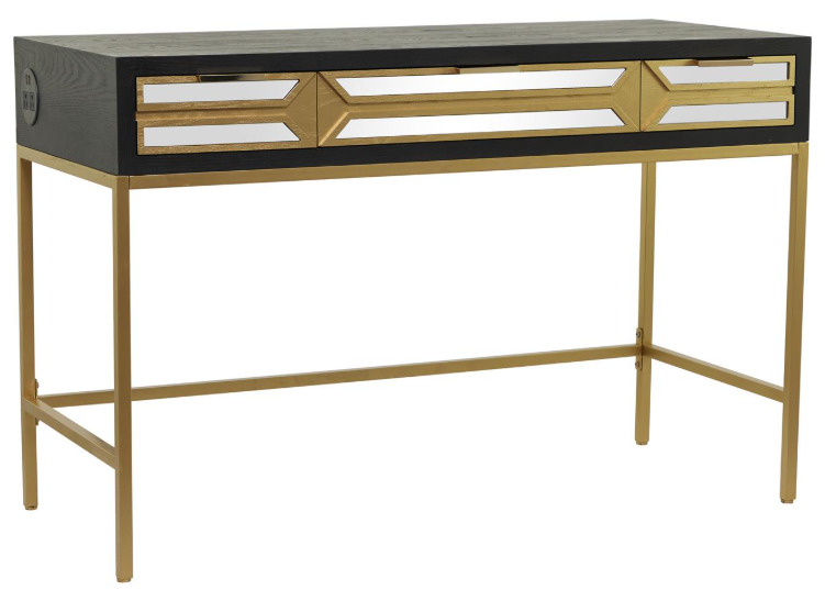 Indulge in the glamorous luxury of plush textures, dazzling details, and sleek finishes to elevate your home and add a sophisticated flair. A 3-drawer console table featuring a black wooden mdf structure with glamorous mirror panels with gold borders and accents along with gold bar handles, gold metal base with feet stoppers, and a functional electrical outlet. This glam desk features a matte black wooden body and gold legs designed with reflective glass mirror drawers. Our rectangular glam office desk features a chic multi-purpose versatility that can be used as a vanity table with its 3 glass drawers and a total of 4 built-in usb ports and electrical power sockets.