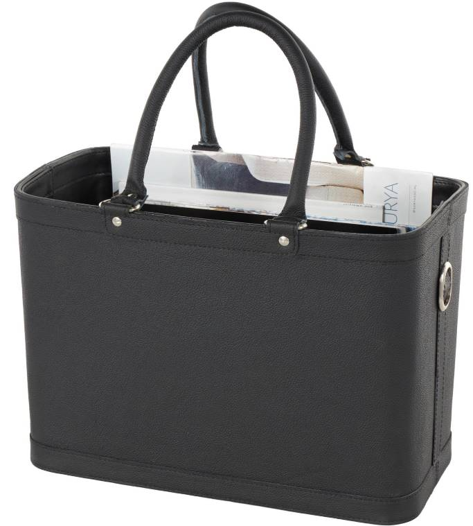 Grainy black magazine storage boasts a sleek rectangular shape, side buckles, and arched handles with stud detailing