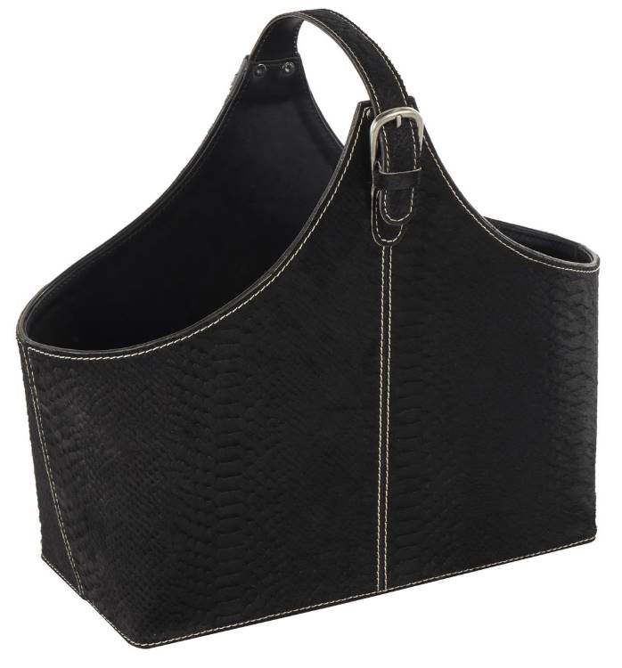 Textured black magazine storage boasts a rounded rectangular shape with a crocodile print and arched buckle handle