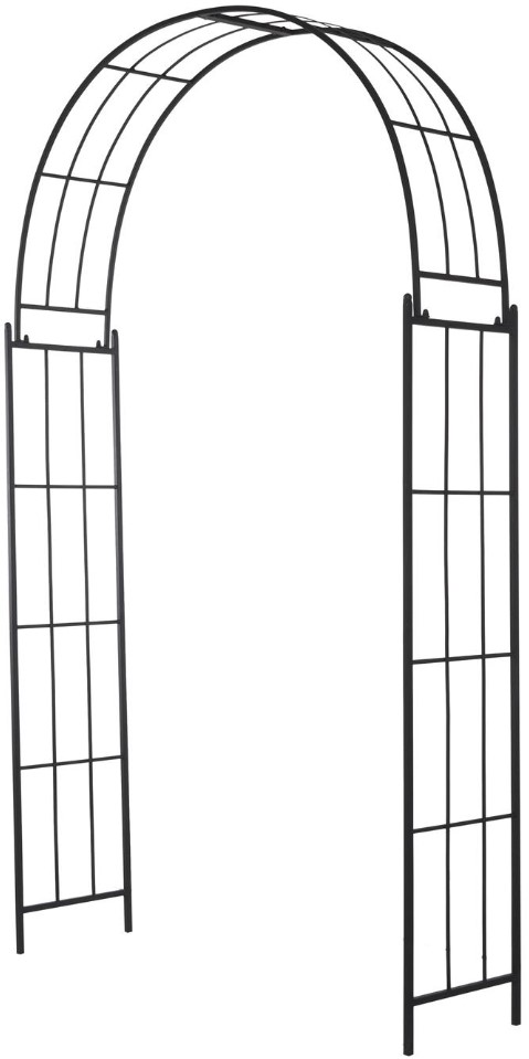 This garden arch arbor highlights a weathered black overall finish. Open lattice framework on its side that arches on top forms the trellis of this garden arch.