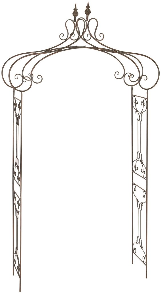 Weathered black garden arbor has a scrolling design for a traditional home-like touch