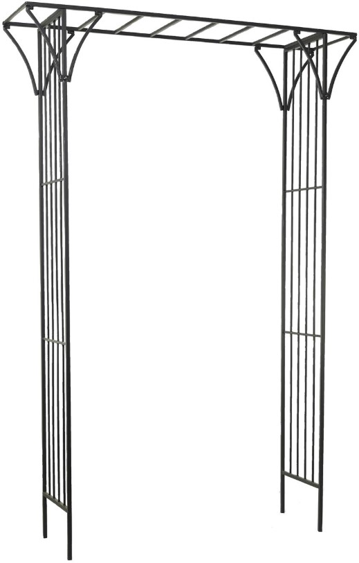 Iron rods are welded together with side support frame to form the sturdy structure of this garden arch