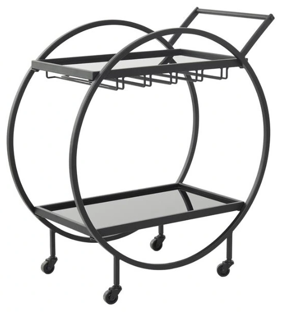 This 2-shelf bar cart accentuates rectangular shelves with circular side frames