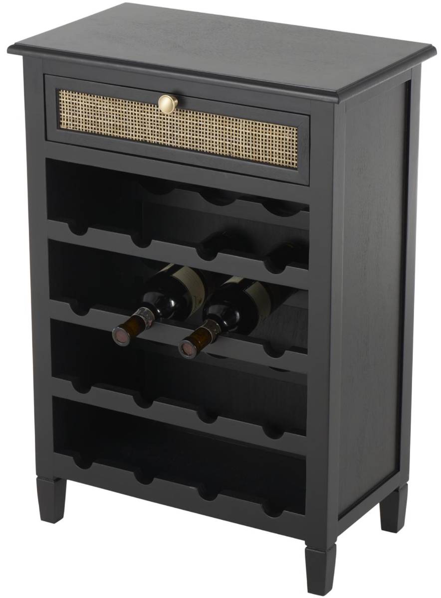Rectangle wine rack is crafted with rattan, pine and MDF and has a black matte finish applied