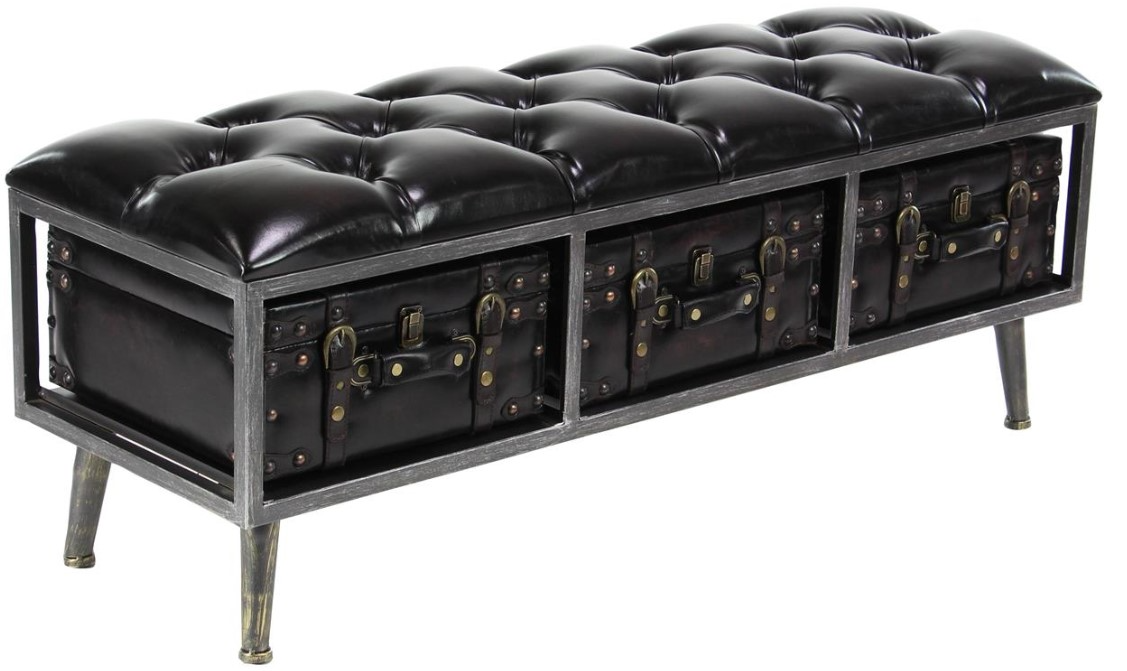 Designed with rugged charm and edgy allure, where metal finishes and raw materials unite to create an urban aesthetic that showcases your artistic expression. This black room storage bench is crafted with fir wood, MDF, iron, and faux leather material.Rectangle storage ottoman bench highlights a smooth black faux leather finish with silver frames and antique gold hardware. This wood storage bench features a tufted seat with under-storage trunks and stands on four tapered legs, providing high clearance space. Smooth black bench with storage boasts a rectangular shape with round beads.