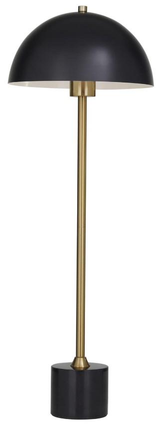 A black marble base and a slim gold metal body, adding a sophisticated touch to any space. The metal desk lamp features an umbrella-style dome shade perched atop a luxurious marble base. This eye catching lamp makes a playful addition to your surface space and beautifully illuminate its surrounding area. This black accent lamp infuses charm and modern appeal into a living room area and bedroom. Designed with felt or rubber stoppers at the base that prevent scratching furniture and table tops, as well as sliding around. The contemporary living room desk lamp is crafted from sturdy metal, featuring a sleek body and shade, all supported by a solid marble base.