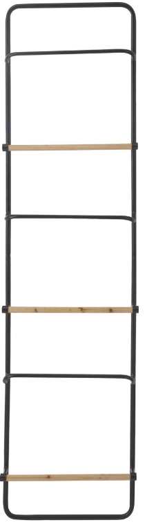 Alternating black and brown finish highlight this ladder rack. A metal frame secures each wooden rod for safe hanging for clutter free zone. Iron is welded into a ladder frame that holds polished wooden rods for a solid structure.