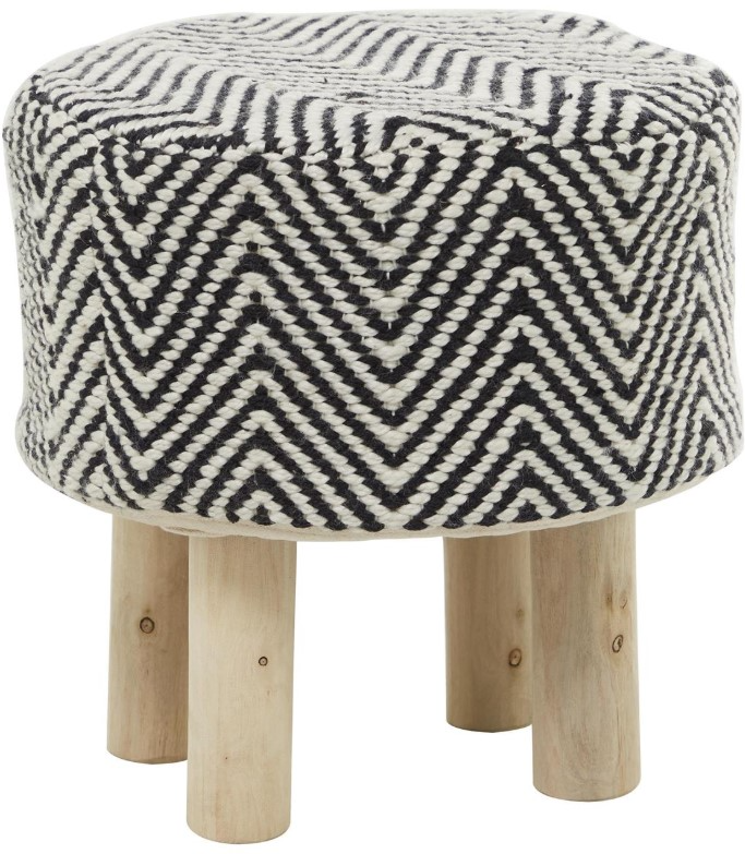 Designed with a free-spirited charm where vibrant hues, eye-catching patterns, and whimsical accents transform your space and showcase your personality. Product is made of polyester and wood and MDF, this short round stool features a polyester woven body in black and white finishes Our bohemian foot stool showcases a round shaped polyester fabric woven base and four wooden feet. Round cushion stool features a stylish tribal woven pattern and four short wooden feet. Polyester fabric is woven and stitched into the base for an eye-catching stool design.