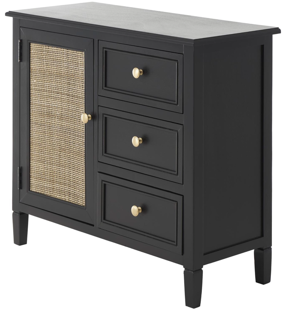 Oiled black storage cabinet for room features a traditional rectangular shape that is enhanced by the sophisticated rattan pattern on the door front and rounded gold knobs