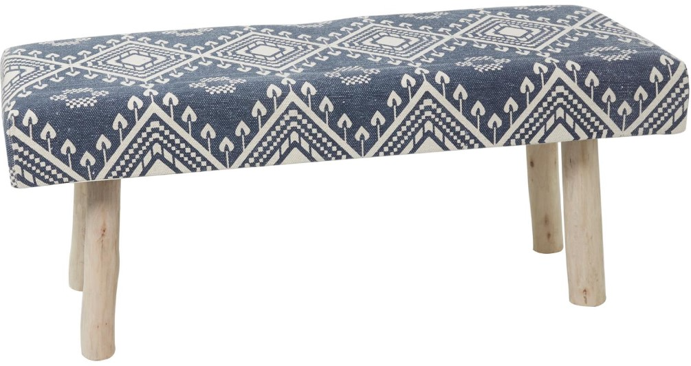 Designed with a free-spirited charm where vibrant hues, eye-catching patterns, and whimsical accents transform your space and showcase your personality MDF, and cotton comprise the make-up of this indoor bench. A solid blue cushioned seat with traditional white patterns is fixed on brown wooden legs Cushioned bench features a rectangle seat with a tribal inspired pattern. Polished wooden legs provide a sturdy support to the rectangle cushioned seat.