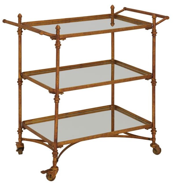This item ships in 1 carton. Suitable for indoor use only. Some assembly required. Maximum weight limit is 30 lbs. This is a single brass colored serving cart. Iron bar cart features 3 shelves. Traditional style.