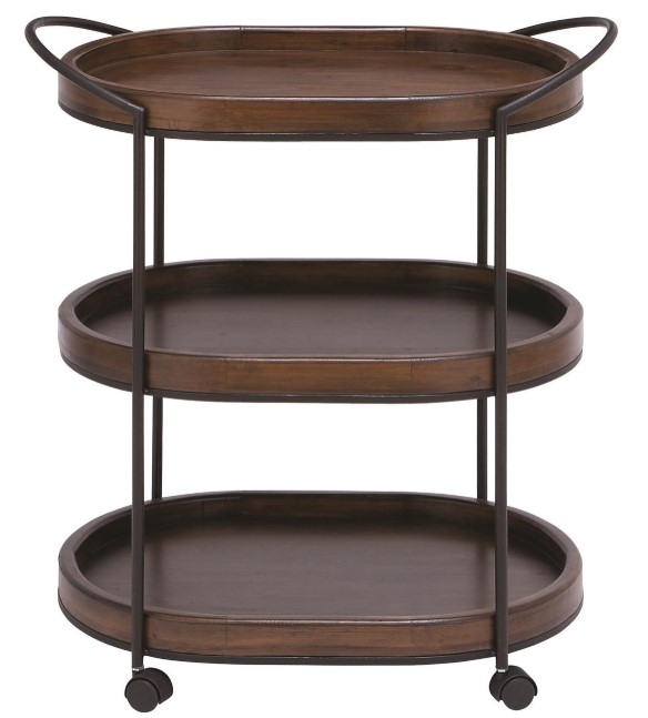 This 3-tier mini bar cart is constructed using welded metal carrying oval wood inlays and four wheels