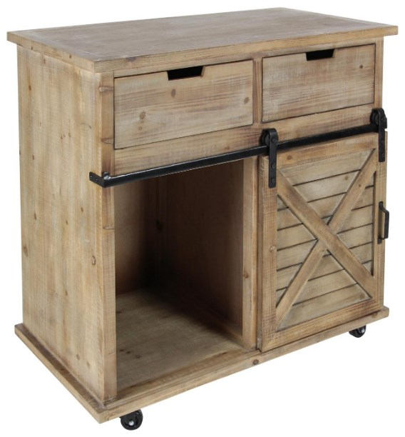 Designed with a farmhouse style for that homey feeling. An extra-large storage cabinet made from solid wood and metal. This farmhouse cabinet with drawers and doors highlights a natural wood light brown finish with black accent details. Decorative furniture that features wood cabinet doors that slides left and right on a metal rack, an open space, 2 pull drawers and caster wheels.
