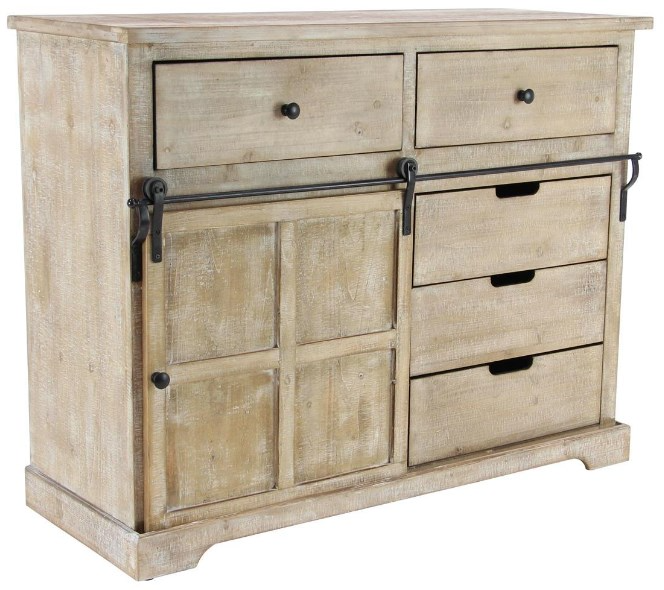Infuse your home with cozy charm, where weathered textures, rustic finishes, and warm earthy tones create a wholesome atmosphere. Large storage chest made from Chinese fir wood and pine wood with iron hardware and handles. Farmhouse sideboard cabinet carries a natural light brown finish with whitewash distressing and black metal hardware. Brown wooden storage unit features a combinations of pull out drawers and a sliding cabinet door for whimsical yet eye catching display.