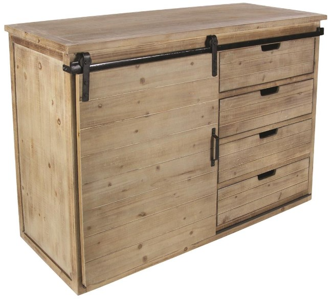 Designed with rugged beauty and an earthy charm, where natural simplicity, warmth, and organic materials create a wholesome atmosphere. Large rustic console storage is made from solid iron and wood. Farmhouse sideboard cabinet carries a natural light brown finish with whitewash distressing and black metal hardware. Brown wooden storage unit features a combinations of pull out drawers and a sliding cabinet door for an efficient yet eye catching design.