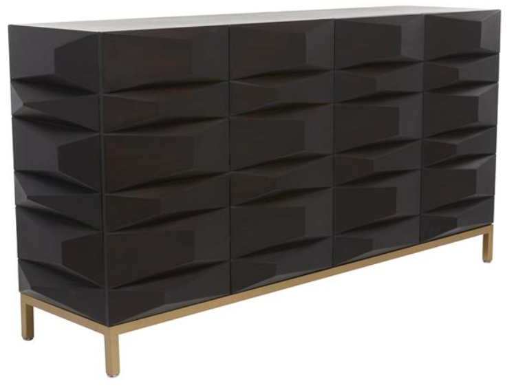 Embrace artistic expression with a style that highlights bold designs with sleek lines, neutral elements, and a minimalist aesthetic. This contemporary brown room cabinet is crafted from robust MDF and metal materials, ensuring durability. Rectangle cabinet for storage highlights a matte brown finish, accented with gold touches that bring a sophisticated look to any space. This wood cabinet features two doors, a spacious interior for storage, an elevated base with under clearance space, and a smooth polished look overall. Matte brown storage cabinet for room showcases a rectangular shape with carved faceted sides adding to its distinct charm. This contemporary cabinet storage is intricately carved from wood to create a unique faceted design that adds to its appeal.