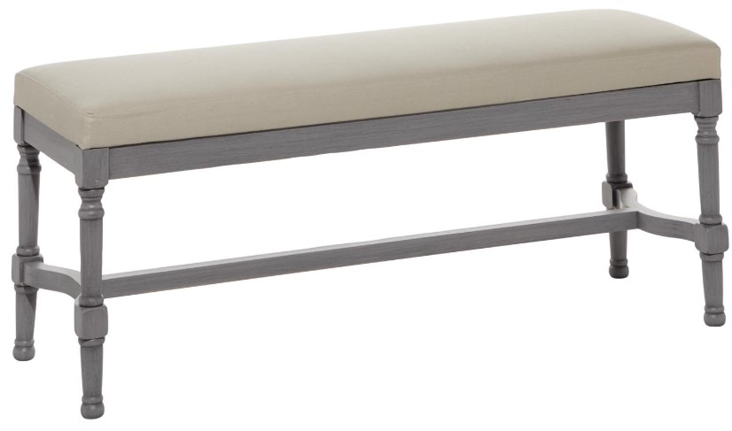 This matte gray entry bench has a rectangular shape and turned wood legs