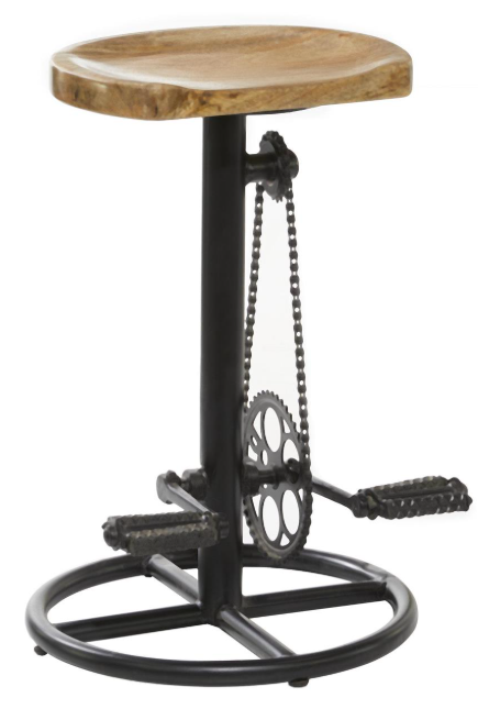 Designed with rugged charm and edgy allure, where metal finishes and raw materials unite to create an urban aesthetic that showcases your artistic expression. Unique bicycle pedal stool is crafted in India and intricately made of iron and mango wood. A counter stool that comes with a brown wooden seat and a black metallic base with pedal design. Features detailed pedals and bicycle gears along with robust metal base that suit any industrial-styled space.