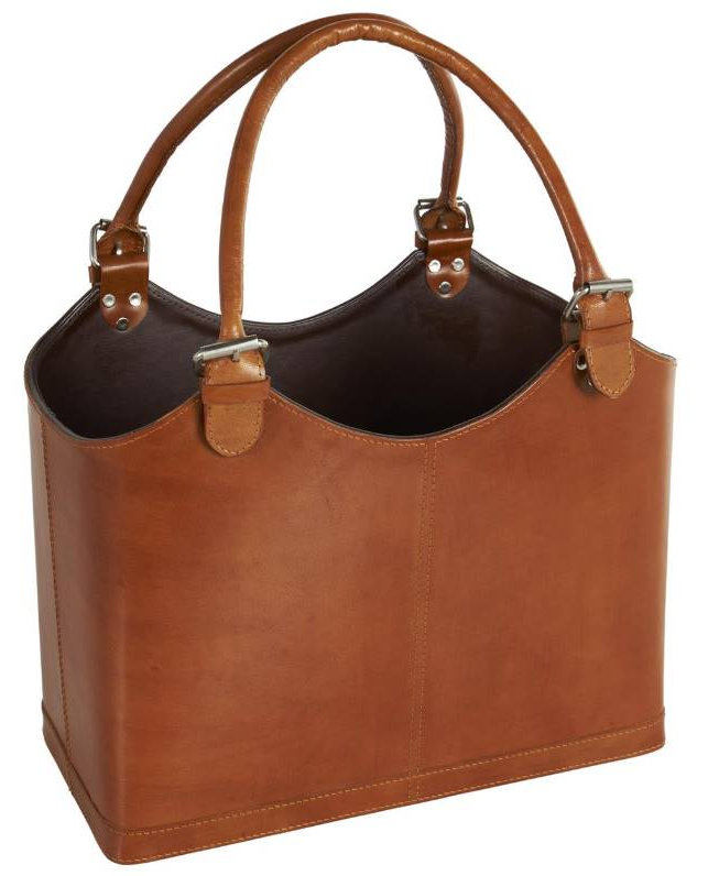 Grainy brown magazine storage boasts a sleek rectangular shape with curved sides and arched buckle handles