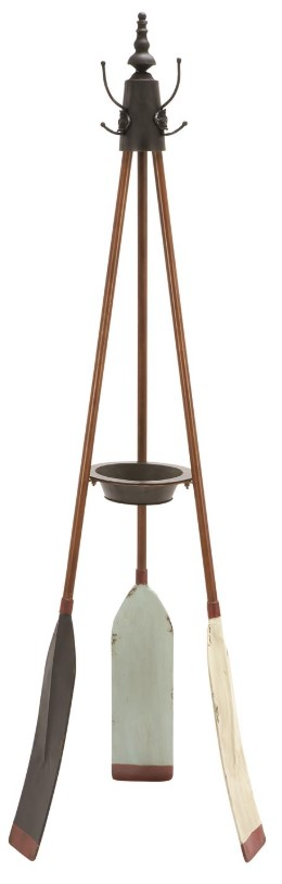 This oar coat rack highlights brown oar shaft with black hardware, white, seafoam blue, navy blue and red tip in distressed finish, Coastal style coat rack features realistic paddles in a tripod structure with duo hooks near finial top and a black bowl secured at the center for additional storage.
