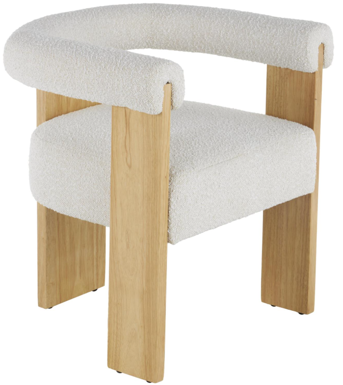 This contemporary small space accent chair features precisely cut wood panels upholstered with boucle fabric