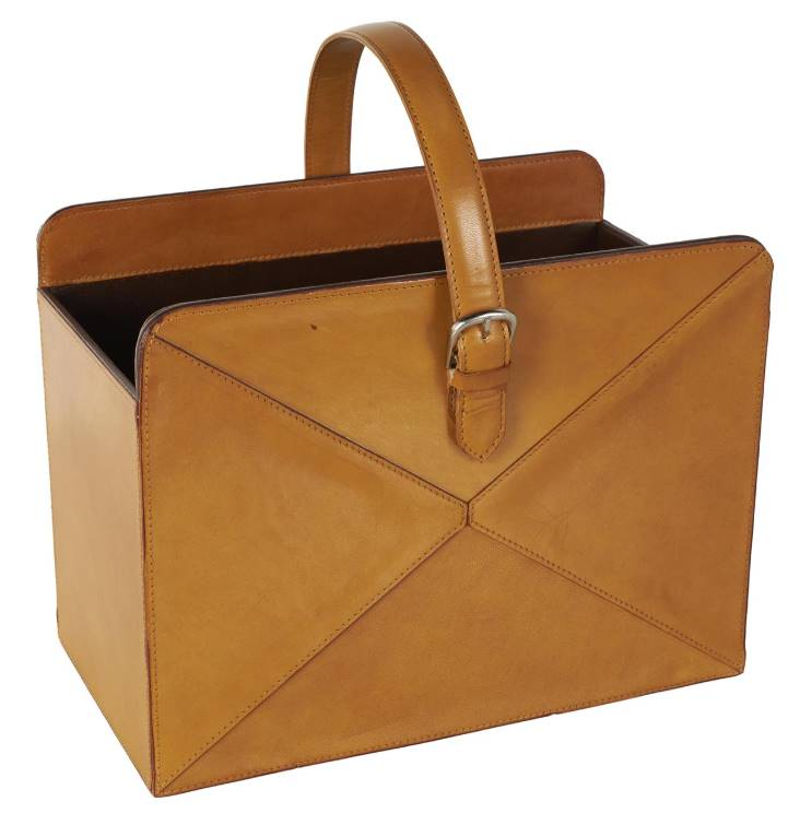 Modern magazine file holder is constructed using shaped MDF material carefully wrapped in leather and finished with a buckle strap for a refined touch