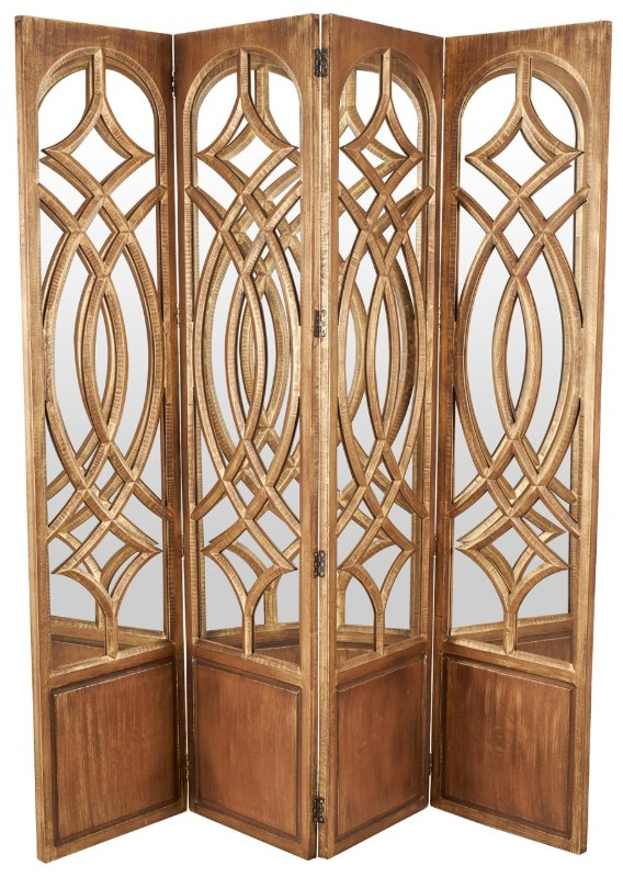 Oiled brown room divider panel maintains a classic rectangular shape with diamonds, ovals, arches adorned in each panel, perfect for versatile placement