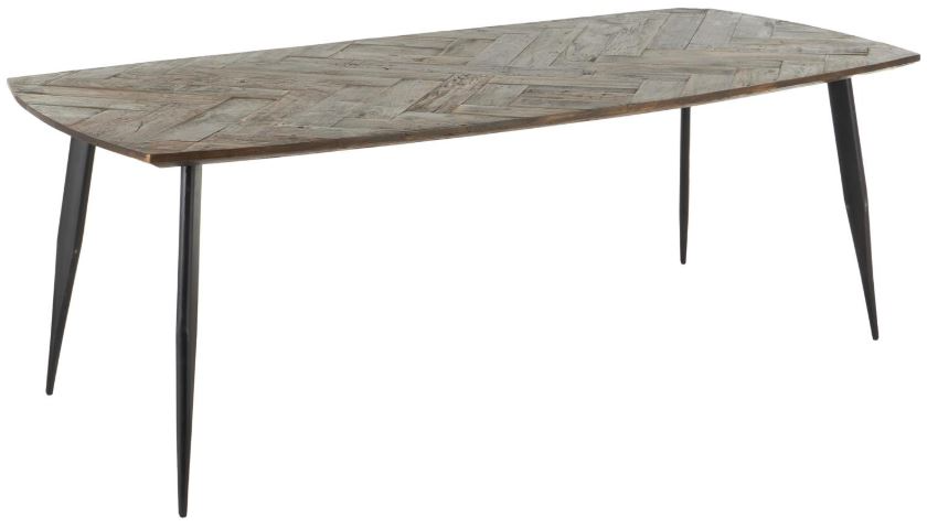 This varnished brown dining table has a classic rectangular shape with chevron patterns on the tabletop that complements any modern decor