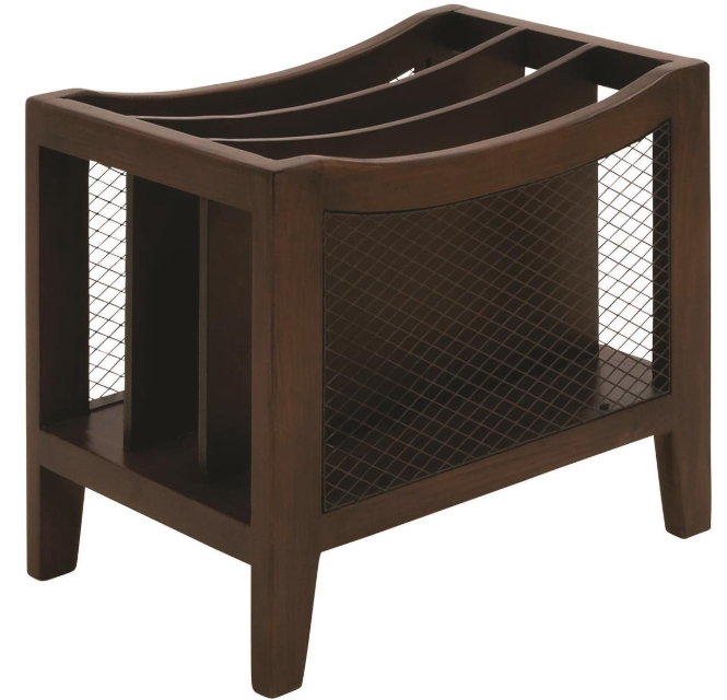 Oiled brown magazine storage features a rectangular shape with a elegantly curved top, enhanced by its elegant mesh detailing