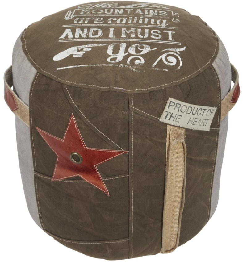 Designed with rugged beauty and an earthy charm, where natural simplicity, warmth, and organic materials create a wholesome atmosphere. This gray pouf feature genuine leather strips and cotton fill. This round pouf ottoman comes in brown and blue finishes with red star accent and white typographiesRead More