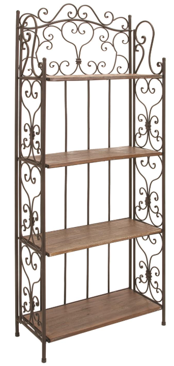 This is a single brown colored display shelf. Iron bakers rack features 4 shelves