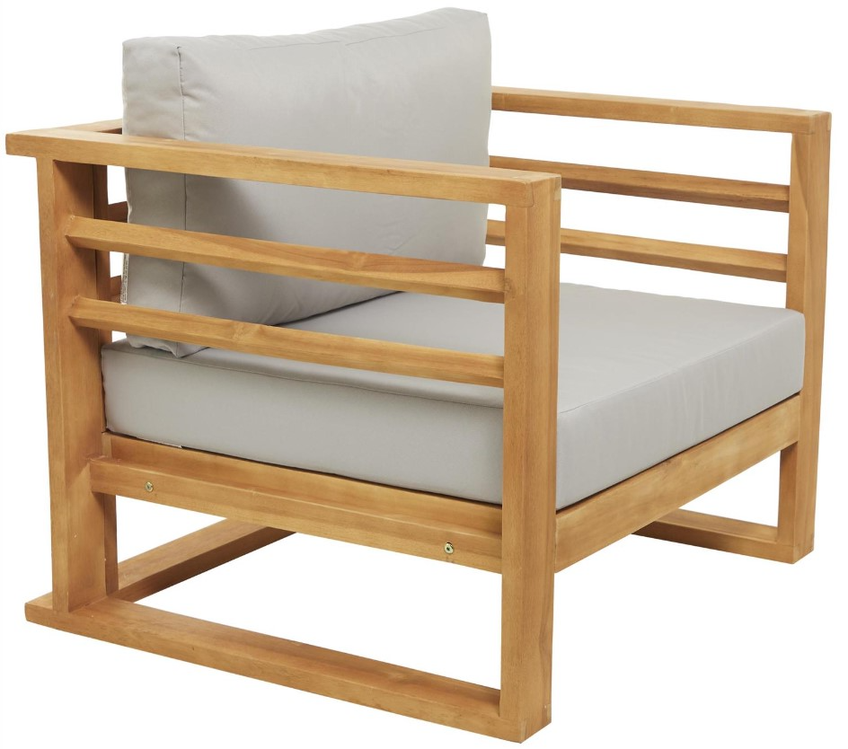 A contemporary style offers neutral elements and basic forms with a bold design. Crafted with teak wood for a solid and durable form. Natural wood brown finish and gray cushions highlights the overall look of this contemporary arm chair.Read More