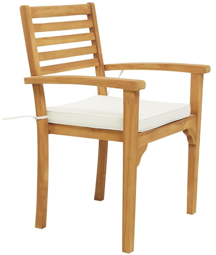 Natural wood brown finish and comfortable white cushion highlights the traditional look of these dining chair. Brown teak wood dining chair feature arm rests and removable plush cushions for all-day comfort. Sturdy outdoor dining chair is perfect for creating a focal point in your home for a comfortable seating arrangement. Create a welcoming and comfortable seating area in your outdoor or indoor space. Enjoy your dining experience with a comfortable seat in these cushioned arm chair, which complement other teak or concrete furniture, for a sophisticated appeal to your outdoor space.