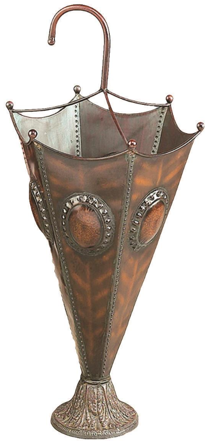 the inner lining has a galvanized look, and the base has a whitewashed finish. Umbrella holder features a rustic design with the use of a bronze-colored metal sheet forming a chamber with the silhouette of a semi-opened umbrella.