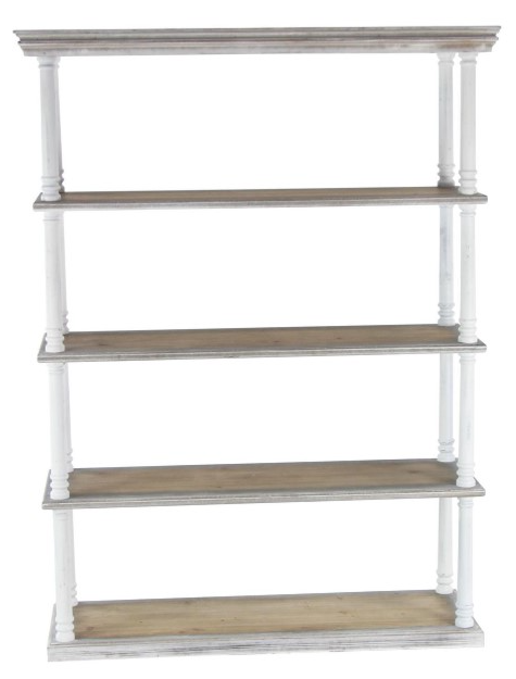 Rectangular shelf organizer features a striking combination of a matte white finish and distressed brown wood, adding visual interest and charm, The MDF shelving unit showcases a towering 5-tier design with spacious racks and turned wood-inspired posts.