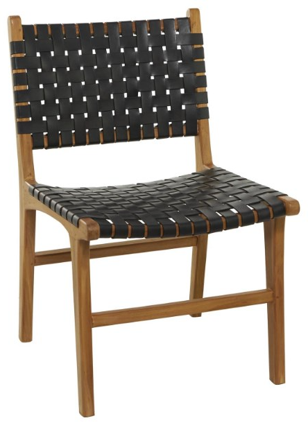 Embrace artistic expression with a style that highlights bold designs with sleek lines, neutral elements, and a minimalist aesthetic. Black accent chair is made of durable and long-lasting teak wood and genuine leather. Modern wood chair feature a polished brown teak wood body with black woven leather in a grid design.Read More