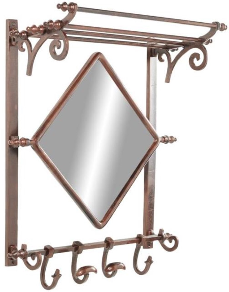 Large copper bathroom rack with hooks and an attached bathroom mirror. Solid aluminum and copper construction. Antique and decoratively-worn metallic copper finish. Features a towel rack, 4 metal hooks, and a diamond mirror. Easy and ready to hang with screws in the allotted holes and removable finials.Read More