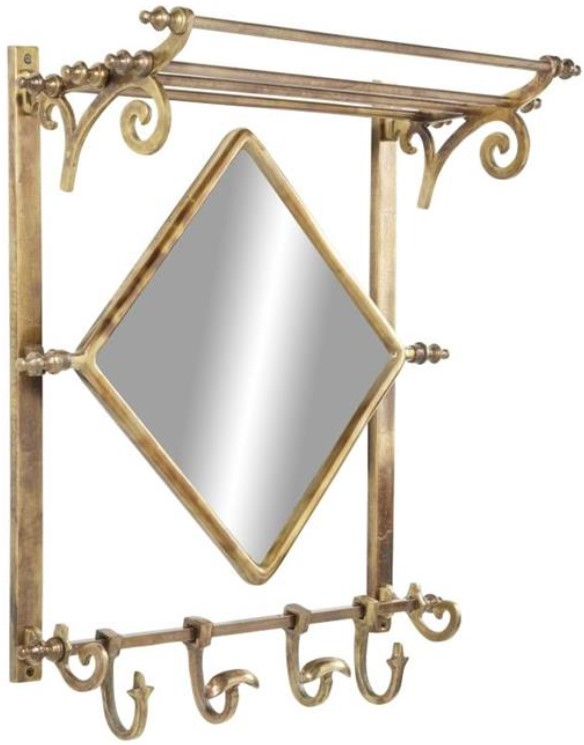 Large brass bathroom rack with hooks and an attached bathroom mirror. Solid aluminum and brass construction. Antique and decoratively-worn metallic gold finish. Features a towel rack, 4 metal hooks, and a diamond mirror. Easy and ready to hang with screws in the allotted holes and removable finials.Read More