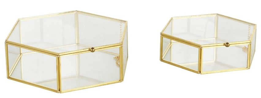 Hexagon jewelry cases set boasts a shiny clear glass exterior, beautifully offset by an elegant gold metal frame that adds a touch of sophistication. This glass set of 2 jewelry boxes features two exquisite hexagonal boxes, each adorned with a delicate chain accent for easy opening and closing