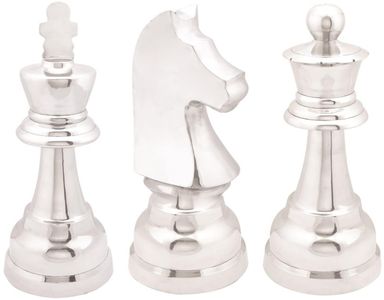Chess decorative statues set has a polished silver finish, creating a striking visual appeal in any space. This aluminum set of 3 sculptures boasts king, knight, and queen chess figures.